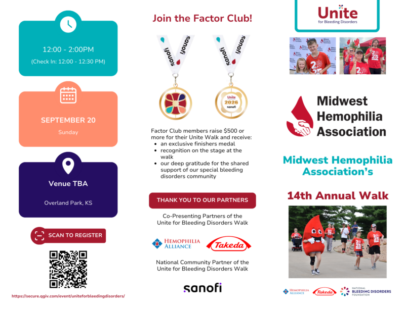 The Midwest Hemophilia Association (MHA) is hosting our annual UNITE for Bleeding Disorders Walk to bring together the community and supporters to raise vital funds which ensure MHA provides support to our local bleeding disorders community. 100% of all individual donations raised go directly to our chapter.